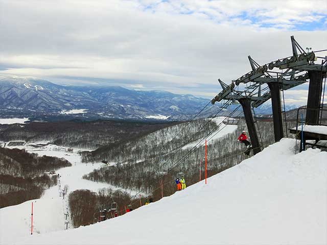 グランデコスノーリゾートは、福島県北塩原村に位置し、磐梯山の北側・裏磐梯エリアに広がるリゾート型のスキー場です。アクセスはJR猪苗代駅から直通バスにて30分ほど。コースは全部で13本あり、初級コースが約45%、中級が35%、上級が20%という構成で最長滑走距離はおよそ4,500mとロングランが可能です。雪質も「神雪」と呼ばれる良質なパウダースノーが楽しめるのが最大の特徴です! 標高1,590mに位置する山頂からは磐梯山や猪苗代湖、遠くは会津の山々まで一望できる雄大な景色は山頂にいった方だけが体験できる絶景です。